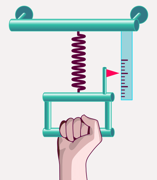 The elongation of the spring tells us the strength of the gravitational force pulling the object towards the ground. This gravitational force is called the object’s weight.