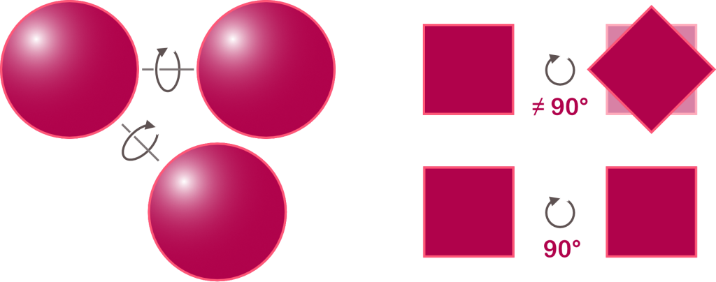 Betrachten wir beispielsweise erneut die beiden bekannten Rotationssymmetrien der Kugel und des Quadrats (Abbildung 1 oben): Nur die Symmetrie der Kugel ist kontinuierlich, während die des Quadrats diskret ist, da das Quadrat bei einer beliebigen winzigen Drehung nicht mehr wie zuvor aussieht.