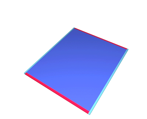 Wir müssen jeweils die beiden türkisblauen und die beiden roten Kanten zur Deckung bringen – etwa, indem wir die Kanten zusammenkleben. Klebt man zwei gegenüberliegende Kanten zusammen, so entsteht ein Rohr. Klebt man dann noch die Kanten des Rohres zusammen, ergibt sich ein Donut oder Torus: